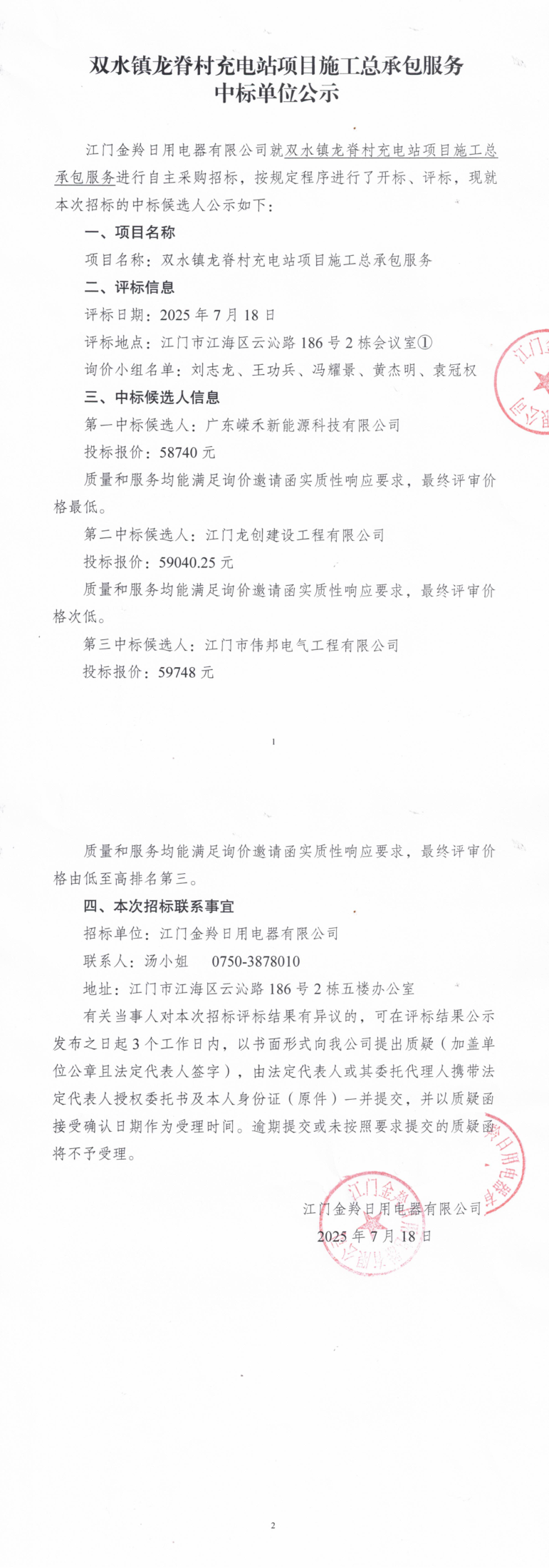 双水镇龙脊村充电站项目施工总承包服务中标单位公示