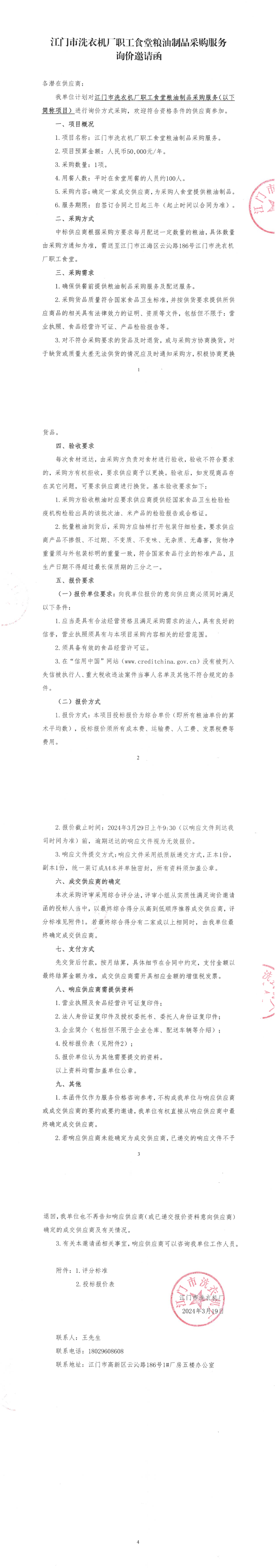 江门市洗衣机厂职工食堂粮油制品采购服务询价邀请函